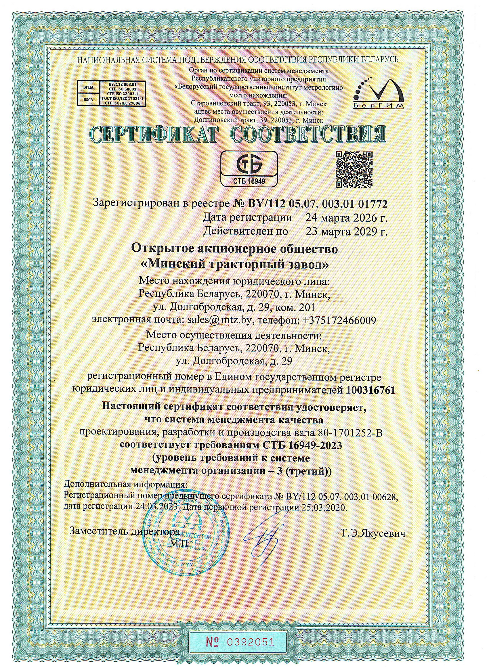 The Quality Management System of OJSC «Minsk Tractor Works» as applied to designing, production and servicing of the tractors, agricultural, forestry, mining and material handling vehicles, as well as construction, road and municipal-purpose products of the BELARUS trademark meets international standards ISO 9001:2015 , National standard STB ISO 9001-2015, СТБ 16949-2023, which is confirmed by relevant certificates.